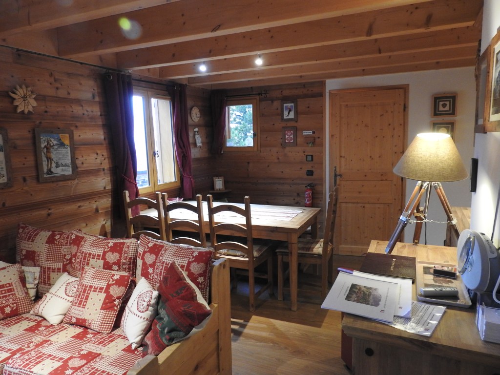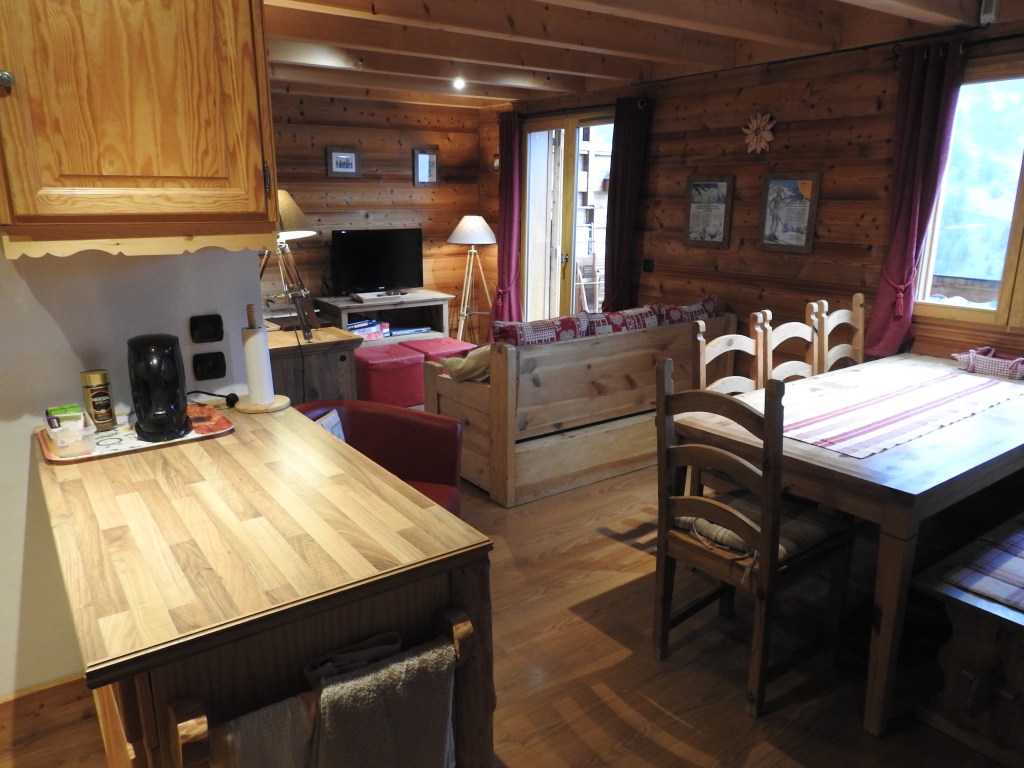 The dining area is open plan with a large wooden table with chairs and a bench. WiFi Internet access is free to guests of the chalet. The dining area looks out onto the terrace and has spectacular views.